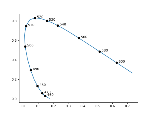 Plot, using Matplotlib, the boundary of the “horseshoe” in the chromaticity diagram which represents pure spectral colors. Labelled points are added to the boundary at default spacing, but \(\lambda\) values can be specified by the iterable
