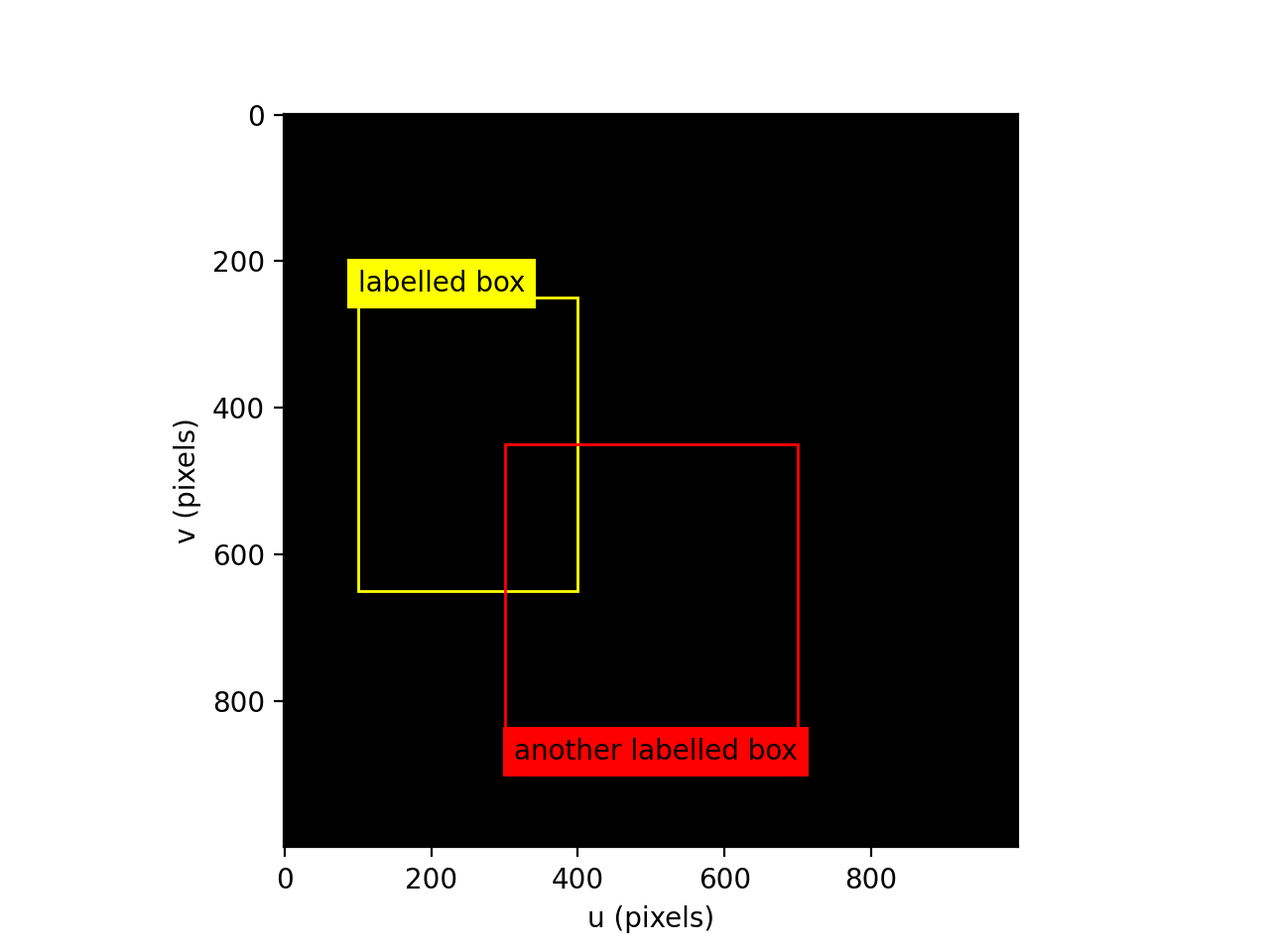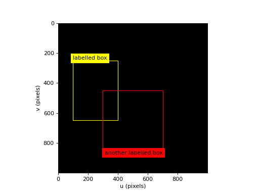 from machinevisiontoolbox import plot_labelbox import numpy as np img = np.zeros((1000, 1000), dtype='uint8') idisp(img) # create a Matplotlib window plot_labelbox("labelled box", lbwh=[100, 250, 300, 400], color="yellow") plot_labelbox('another labelled box', position="bottomright", lbwh=[300, 450, 500, 400], color="red")