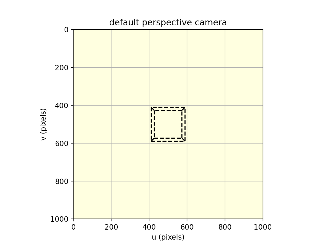 >>> from machinevisiontoolbox import CentralCamera, mkcube >>> from spatialmath import SE3 >>> camera = CentralCamera.Default() >>> X, Y, Z = mkcube(0.2, pose=SE3(0, 0, 1), edge=True) >>> camera.plot_wireframe(X, Y, Z, 'k--')