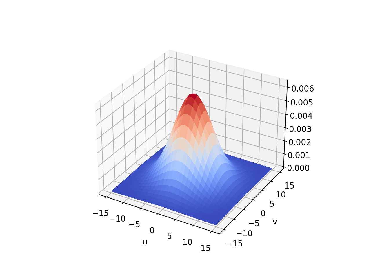 sigma\[\mathbf{K} = \frac{1}{2\pi \sigma^2} e^{-(u^2 + v^2) / 2 \sigma^2}\]The kernel is centred within a square array with side length given by: